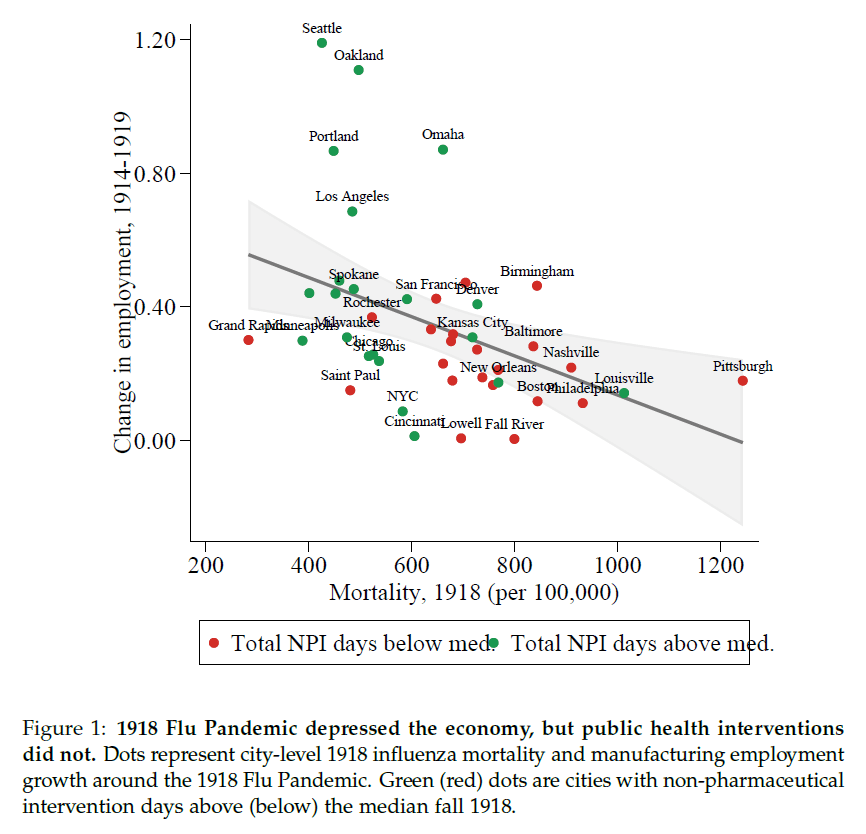 The green-dot cities in the upper left who enacted strict NPIs like social distancing over longer periods had lower mortality and higher economic growth whereas the red-dot cities in the lower right, who were more lenient with NPIs, experienced higher mortality and stunted economic growth. The authors say it best.