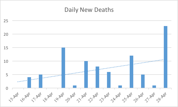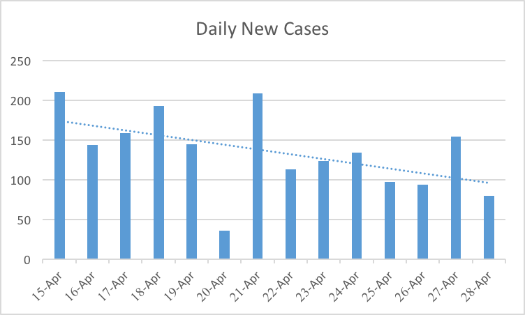 What you probably can see is that there appears to be an overall decline in Daily New Cases in Riverside over the last several weeks. Most days in the last week are running under 100 new cases. It’s a general trend and there’s a lot of noise here so it’s difficult to draw any solid conclusions. One thing to note is the odd reporting on April 20. That day there were problems with the State’s data entry tool, CalREDIE. The 22nd made up for that when the system was working better but it’s probably more accurate to average those two days to something more like 122 and 123.