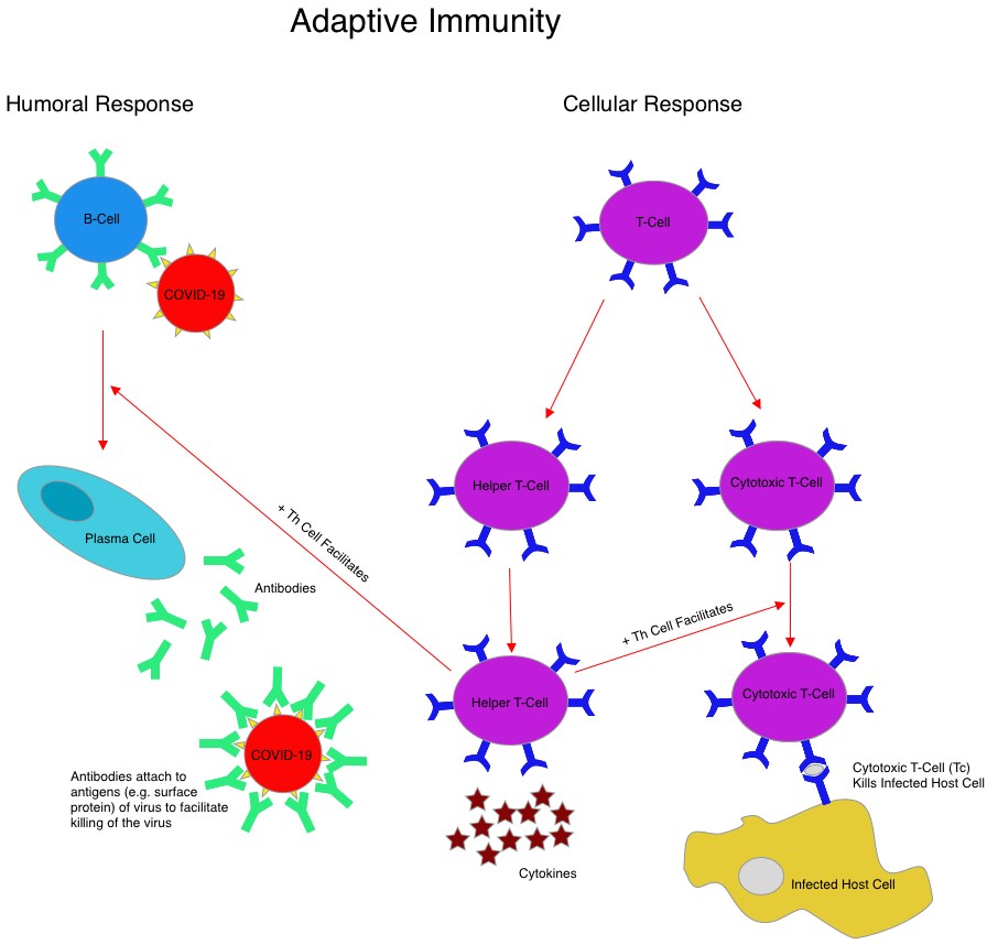 Adaptive immunity involves B-cells (humoral response) and T-cells (cellular response). These cells are attracted to the battle between the specialized white blood cells and the pathogen by signals from the innate immune system cells. B-cells, after coming in contact with a pathogen make antibodies specific to it. These circulating antibodies can then coat the pathogen, making it harder for it to attach to our cells and easier to be identified for killing by other immune cells. Two types of T-cells are important in the immune response to infection. Cytotoxic T-cells become potent killers of cells that have been infected with the pathogen. This is important because an infected cell becomes a factory for making new virus so the body must destroy it to stop the spread. T-helper cells create chemical messages (cytokines) that stimulate the B-cells to make more antibodies to the pathogen, help Cytotoxic T-cells to destroy more infected cells and macrophages to attack the pathogen directly.