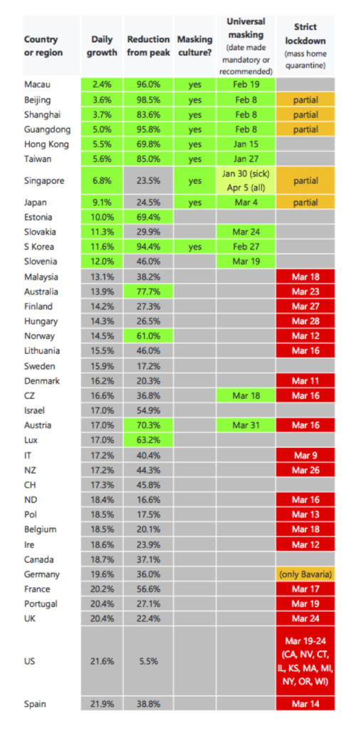 Similarly, the researchers looked at daily growth curves to show that countries with universal masking culture or early and comprehensive adoption of masking had significantly flatter disease curves than countries that don’t wear masks to any large degree.