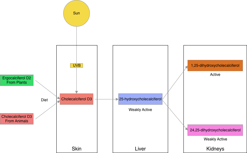 First, and briefly, let’s talk about what Vitamin D is. The term Vitamin D actually describes a group of chemicals important for normal human health. The Vitamin D chemicals are steroid molecules predominantly thought of as an important factor in calcium and phosphorus metabolism in the body and normal bone growth. Many cell types in the body, however, have Vitamin D receptors so its role throughout the body may be more complex and not yet fully understood. Humans get their Vitamin D from a few different sources; one important way to get Vitamin D is to eat it. Ergocalciferol (Vitamin D2) comes from some plants like mushrooms and is the primary form of Vitamin D in fortified foods like milk. Cholecalciferol or Vitamin D3 is found in meat, egg yolks, liver and fatty fish. Humans can also make Vitamin D through sun exposure. A common form of cholesterol (7-dehydrocholesterol) present in skin is converted to cholecalciferol or Vitamin D3–the UV light actually provides the energy for this conversion. So while we can get Vitamin D2 and Vitamin D3 in our diets and through UV light we can make Vitamin D3 in our skin, neither molecule is biologically active for humans. These forms of Vitamin D need to be further converted to active molecules in the liver and then in the kidneys. First, in the liver, cholecalciferol is converted to 25-hydroxycholecalciferol which has weak activity. This molecule is then converted in the kideys to 24,25-dihydroxycholecalciferol, which is also weakly active or 1,25-dihydroxycholecalciferol which is the active form of Vitamin D. This active form then goes on to significantly increase the absorption of calcium in the intestines.