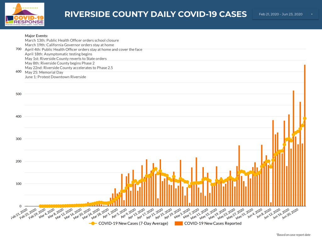 So looking at a population like Riverside County can be challenging compared to larger centers around the country. There will inevitably be variations in the graphs because of a relatively smaller population and regional reporting characteristics.