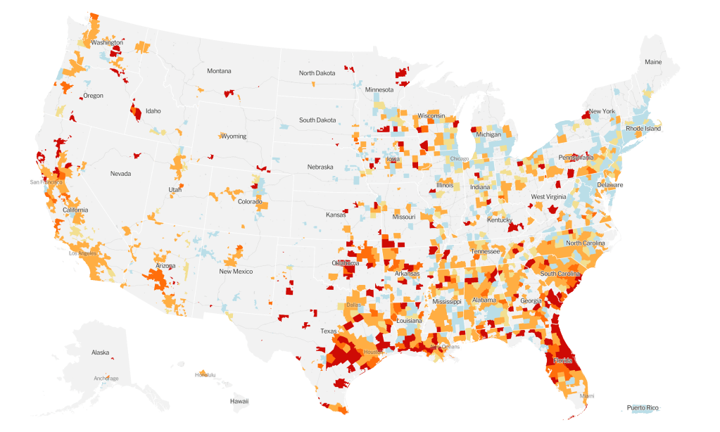 NY Times map showing areas with increasing numbers of cases of COVID-19