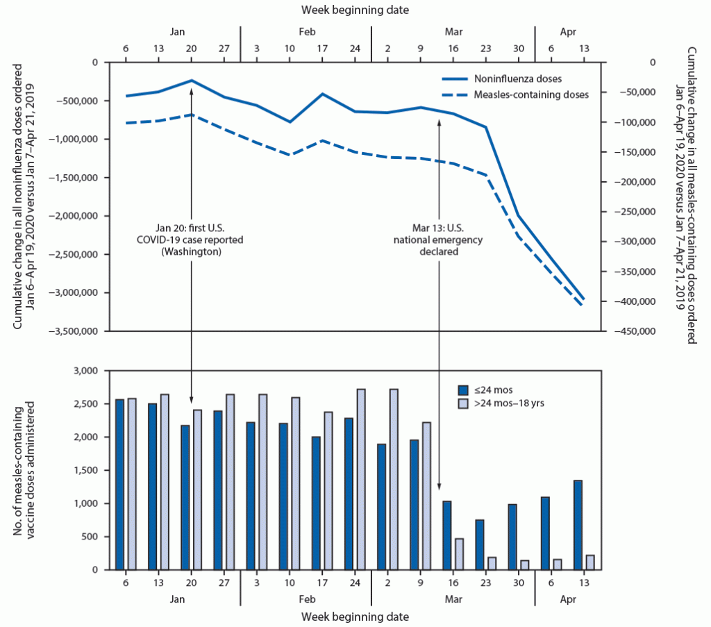 Santoli JM, Lindley MC, DeSilva MB, et al. Effects of the COVID-19 Pandemic on Routine Pediatric Vaccine Ordering and Administration — United States, 2020. MMWR Morb Mortal Wkly Rep. ePub: 8 May 2020. DOI: http://dx.doi.org/10.15585/mmwr.mm6919e2external icon